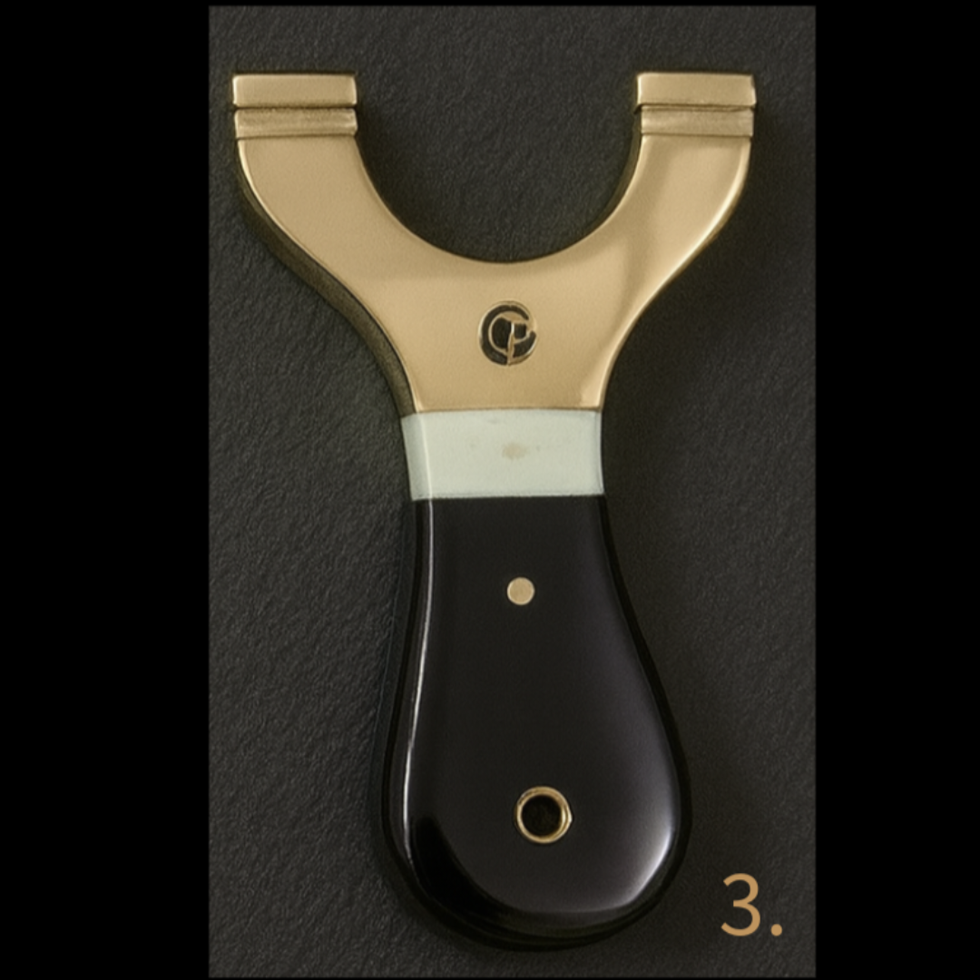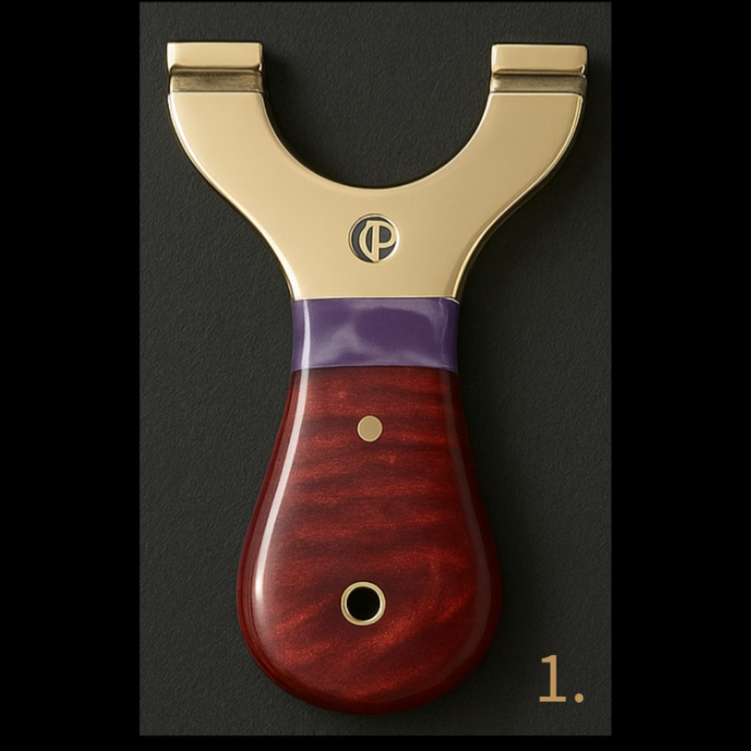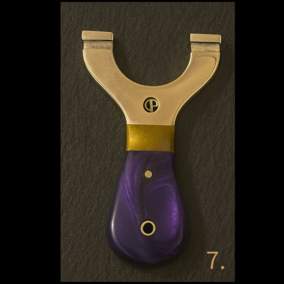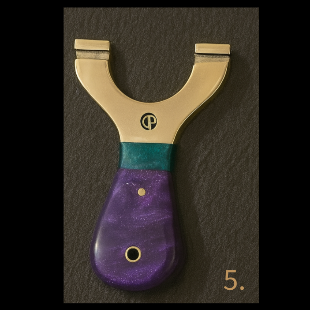 These MINI Custom Brass-Top Slingshots are built around solid polished steel cores, topped with our premium rounded brass tops, and finished with CP custom brass pins for that unmistakable Catty Precision signature.