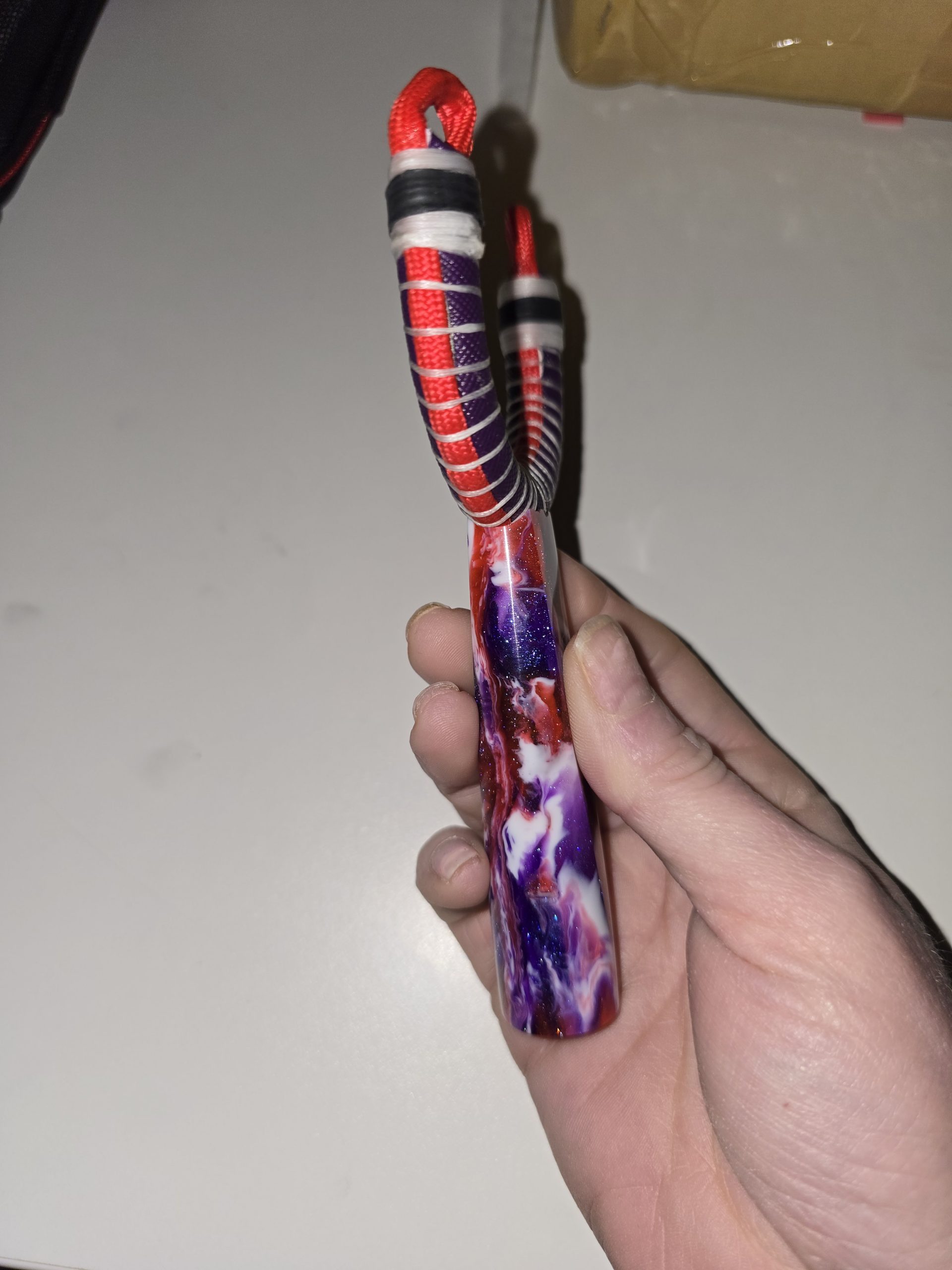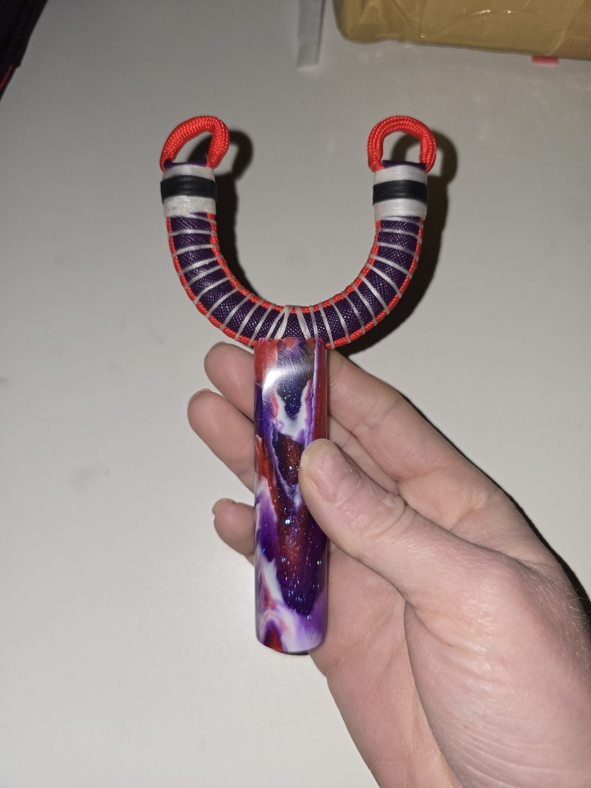 • Custom handmade gypsy slingshot with red, purple & white glitter resin handle