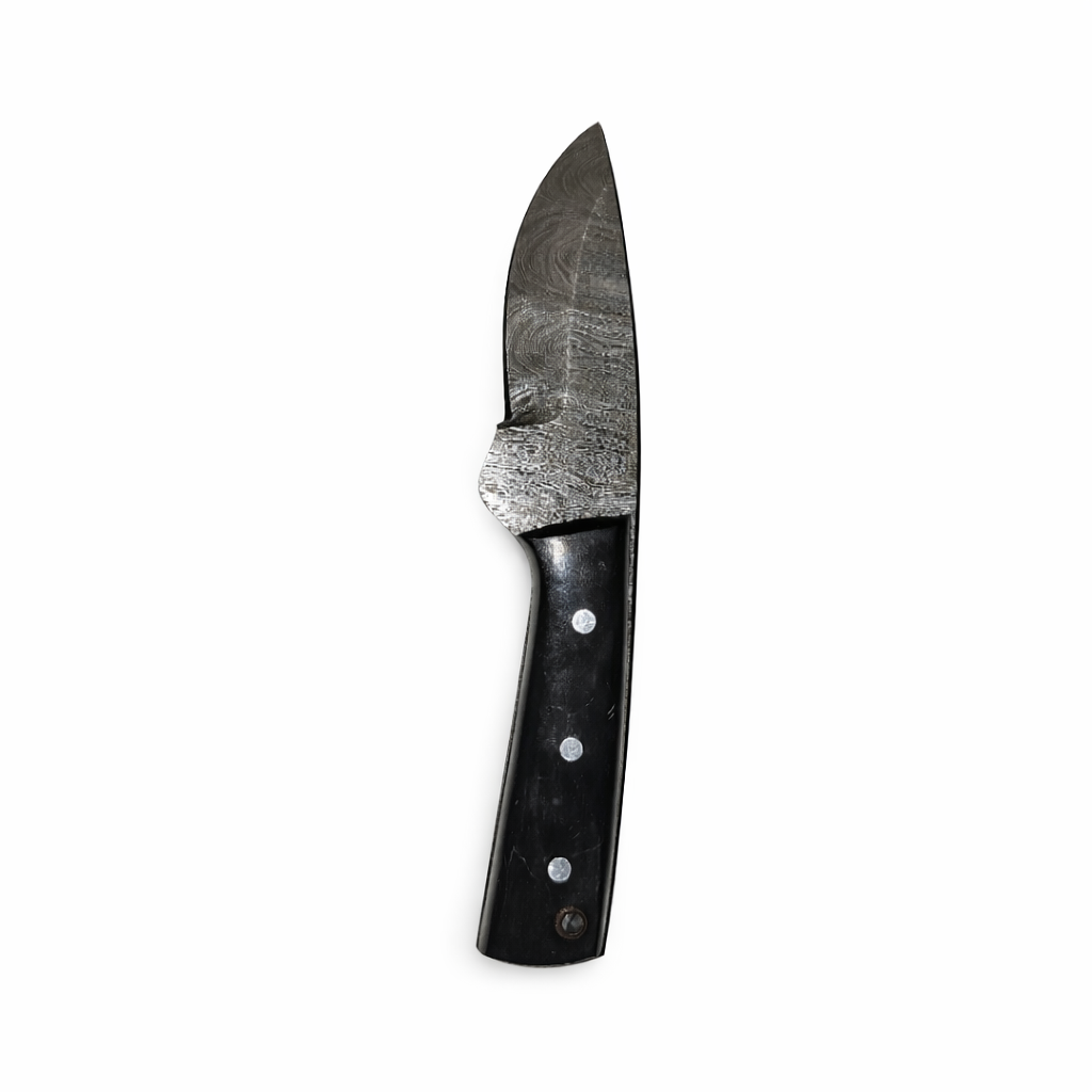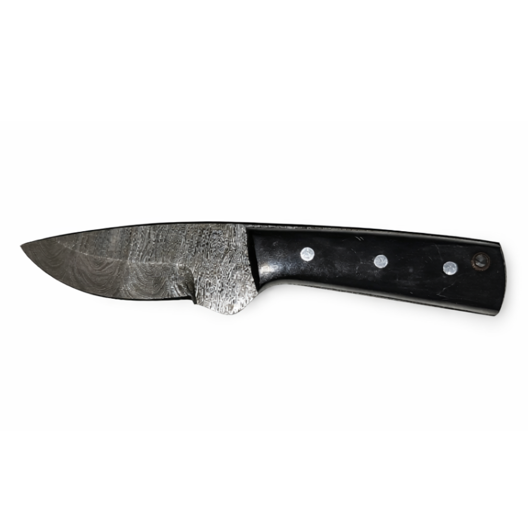 This fixed blade features a hand-forged Damascus steel blade, offering excellent strength, edge retention, and a striking layered pattern — meaning no two knives are ever the same. The blade uses a practical drop-point profile, making it highly versatile and ideal for hunting, bushcraft, game preparation, and general outdoor cutting tasks.