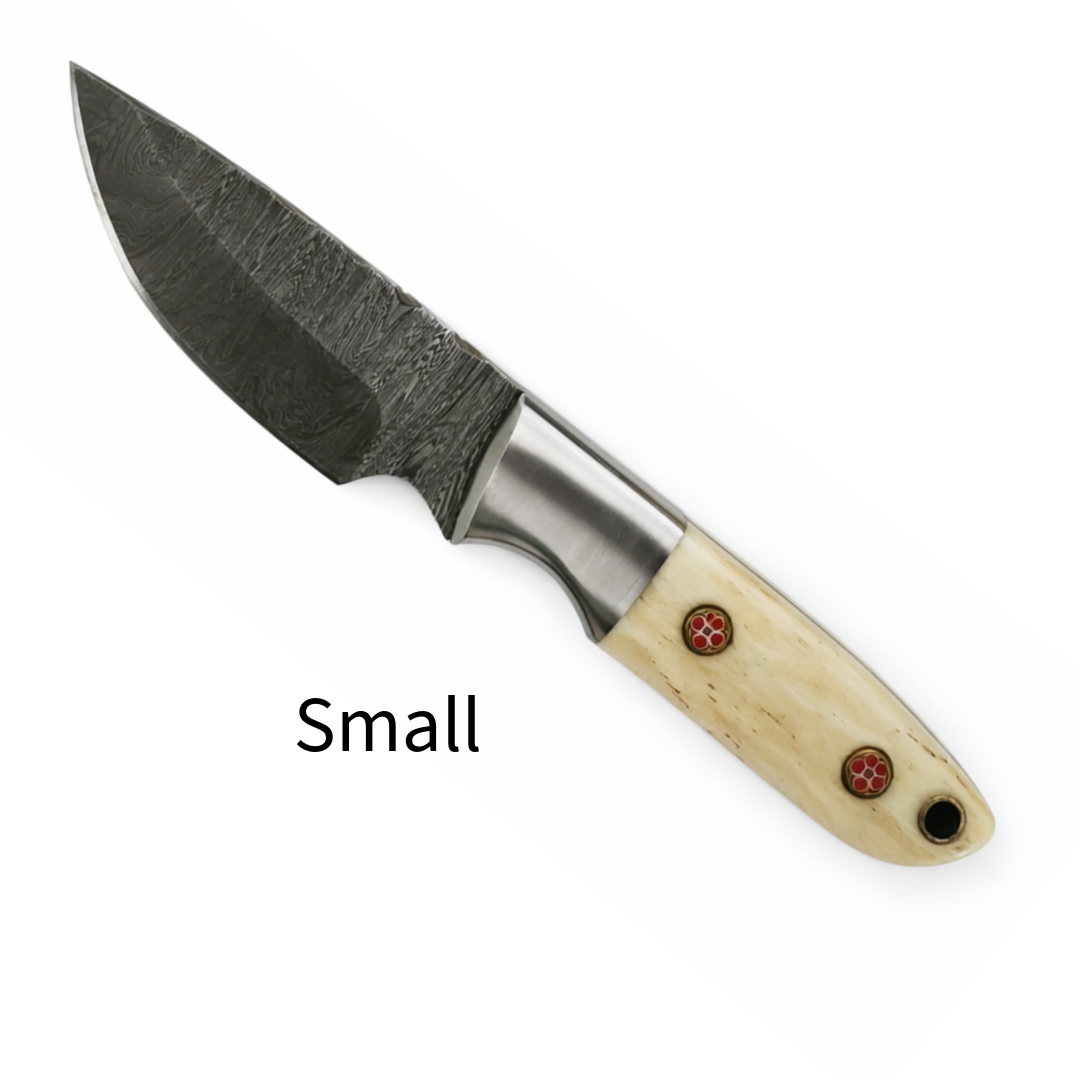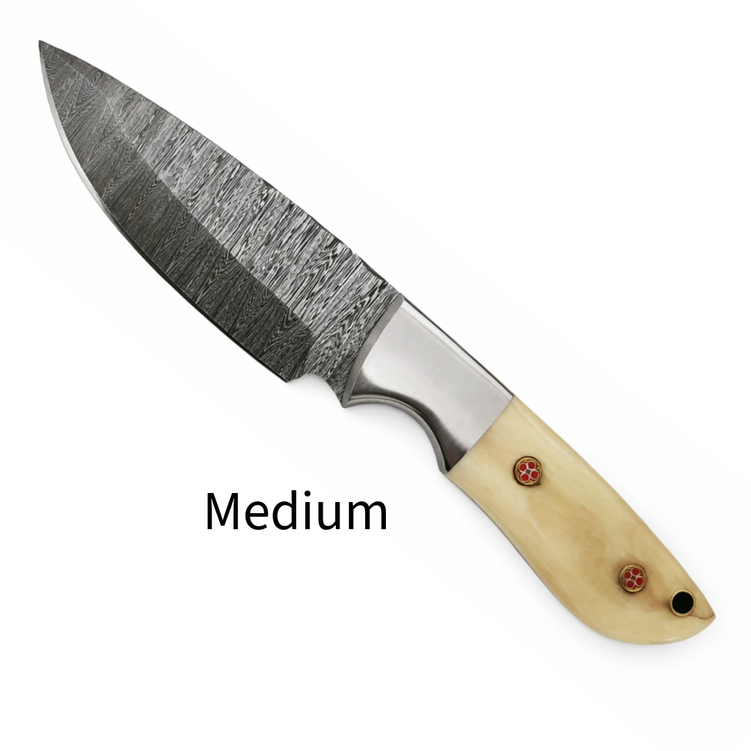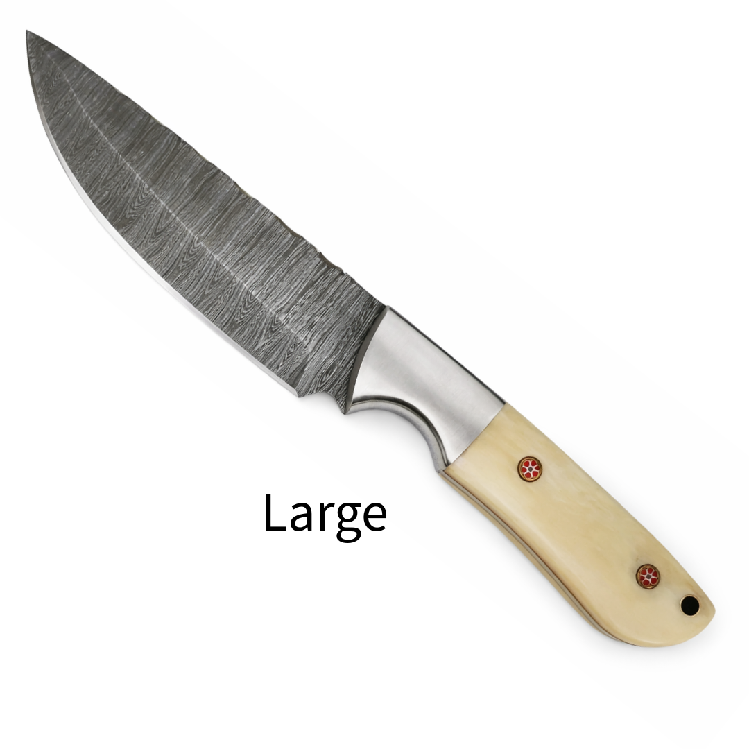 Handcrafted Damascus Hunting Knife – Bone Handle with Steel Bolster (Small / Medium / Large)