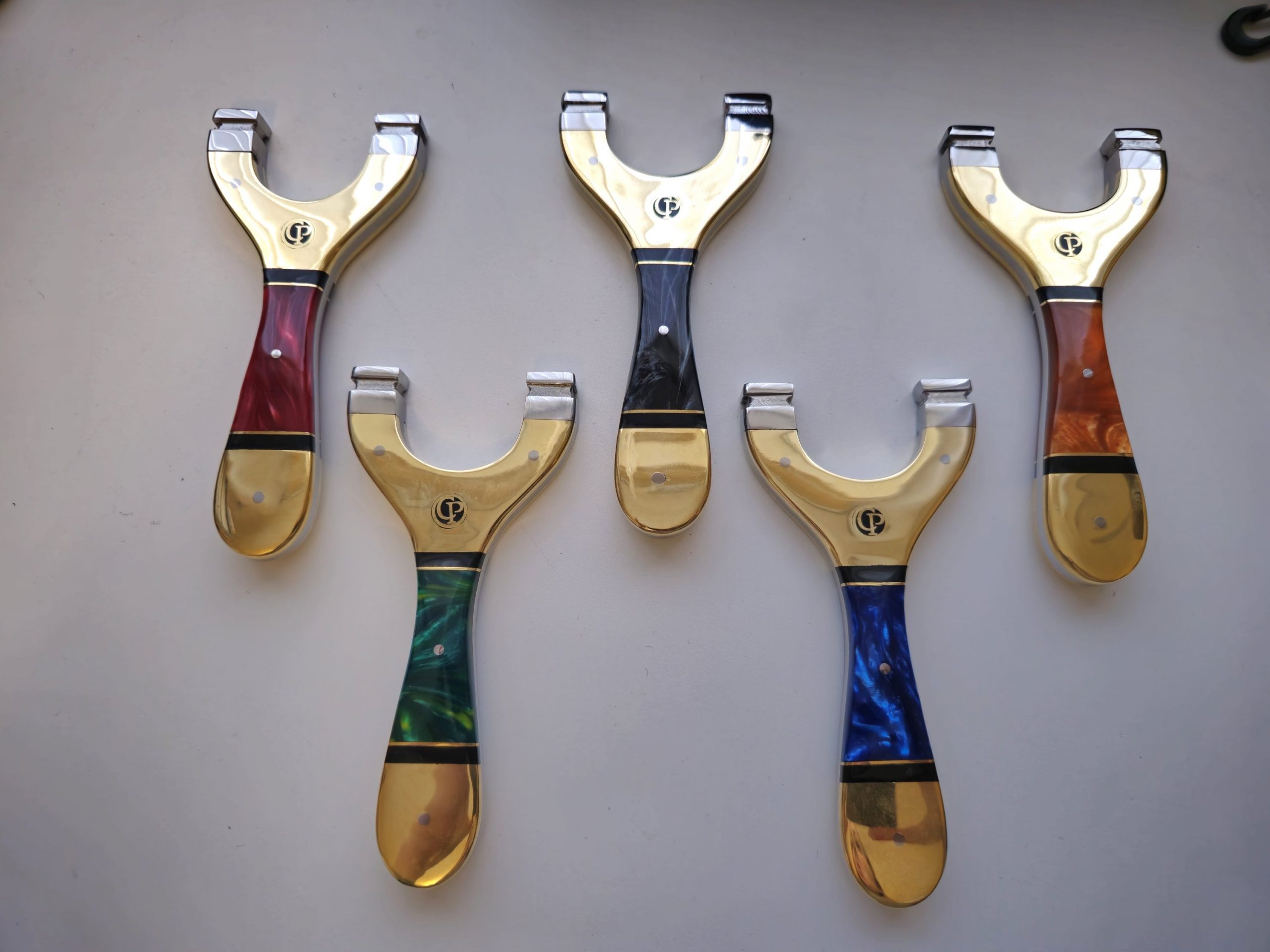 Premium Brass Slingshot with Green Shimmer Resin Handle – Catty Precision Exclusive