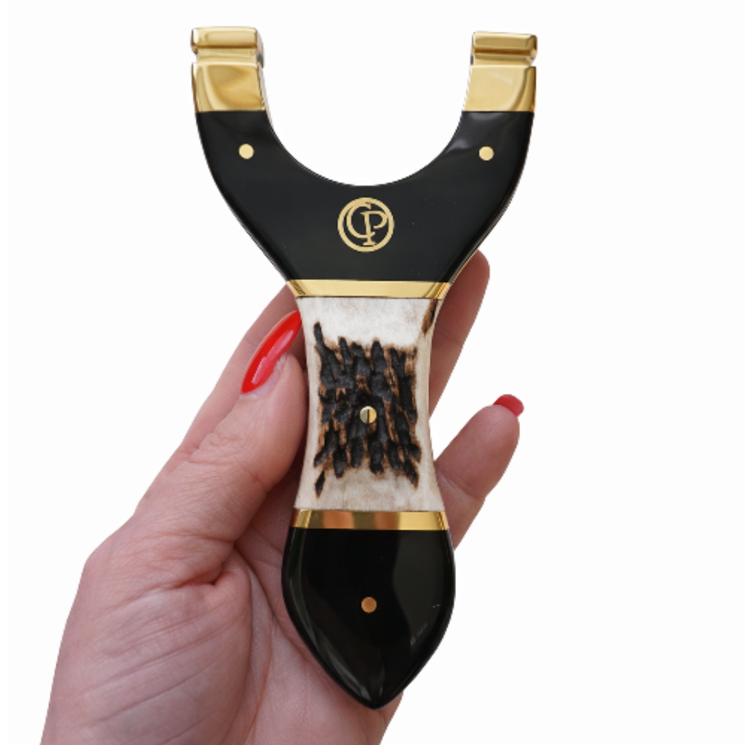 The Catty Precision Vanguard is a refined, field-ready OTT slingshot built for shooters who value strength, control and natural materials. This model combines a deep black horn fork top and handle base with a genuine stag (deer antler) handle section, creating a rugged yet elegant design that performs as well as it looks.